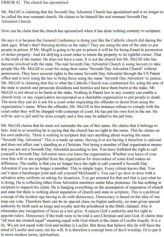 The author concludes this section by claiming that Mr. McGill “deserves” to go to jail (none of us expects to be burnt at the stake, to reply to the ridiculous hyperbole), because he has “stolen” the SDA name.  Here is one specific point: