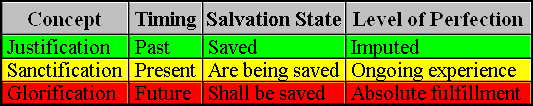 Zahakiel: Now, you see what we have done; we have classified the terms justification, sanctification and glorification in terms of several principles that we can place in a little chart (which I have conveniently posted for the occasion):